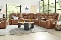 Music fills the air and a bold silhouette overflows with deep, luxurious comfort as the Amplify collection from Sound Tech by Shaq creates a space where relaxation, sound, and style blend together with natural rhythm. Upholstered in rich brown top grain leather where the body touches, this transitional sectional pairs sculpted, contoured seating with refined stitching and bold black trim. Triple power reclining offers adjustable lumbar, headrest and footrest controls as well as air massage and zero-gravity positioning for total relaxation. The built-in bluetooth enabled sound system surrounds with immersive audio, seamlessly syncing between recliners and bluetooth devices. Remotes with charging cradles and dual USB ports are built into the outside arms and recliners, while hidden storage and stainless steel cupholders preserve the sleek profile's effortless style. Upholstery: Top grain leather where the body touches and polyurethane fabric sides and backs. Leather is a durable, low maintenance product, however, general regular maintenance is necessary. To keep your leather clean, vacuum it regularly, removing any dust, and clean it with water and a mild non-detergent soap.