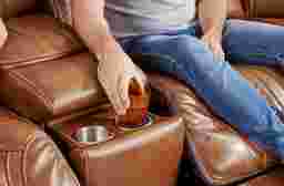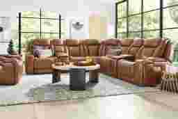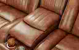 Music fills the air and a bold silhouette overflows with deep, luxurious comfort as the Amplify collection from Sound Tech by Shaq creates a space where relaxation, sound, and style blend together with natural rhythm. Upholstered in rich brown top grain leather where the body touches, this transitional sectional pairs sculpted, contoured seating with refined stitching and bold black trim. Triple power reclining offers adjustable lumbar, headrest and footrest controls as well as air massage and zero-gravity positioning for total relaxation. The built-in bluetooth enabled sound system surrounds with immersive audio, seamlessly syncing between recliners, the console, and bluetooth devices. Remotes with charging cradles and dual USB ports are built into the outside arms and recliners, while hidden cupholders and storage preserve the sleek profile's effortless style. Upholstery: Top grain leather where the body touches and polyurethane fabric sides and backs. Leather is a durable, low maintenance product, however, general regular maintenance is necessary. To keep your leather clean, vacuum it regularly, removing any dust, and clean it with water and a mild non-detergent soap.