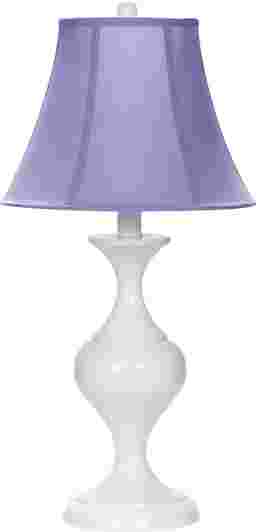 Classic, clean and charming, the Ana lamp adds an elegant glow to any space. Featuring an hourglass shaped white metal base, this adorable lamp is topped with a flared purple shade, making it a must in your little one's room or play area.