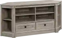 The Anacacho gray corner console accommodates up to a 60-inch TV weighing 95 pounds or less. Two adjustable shelves hold audio and video equipment. Two adjustable corner display shelves. Drawers with metal runners and safety stops feature T-lock assembly system. Enclosed back panel with cord access. Customer assembly is required.