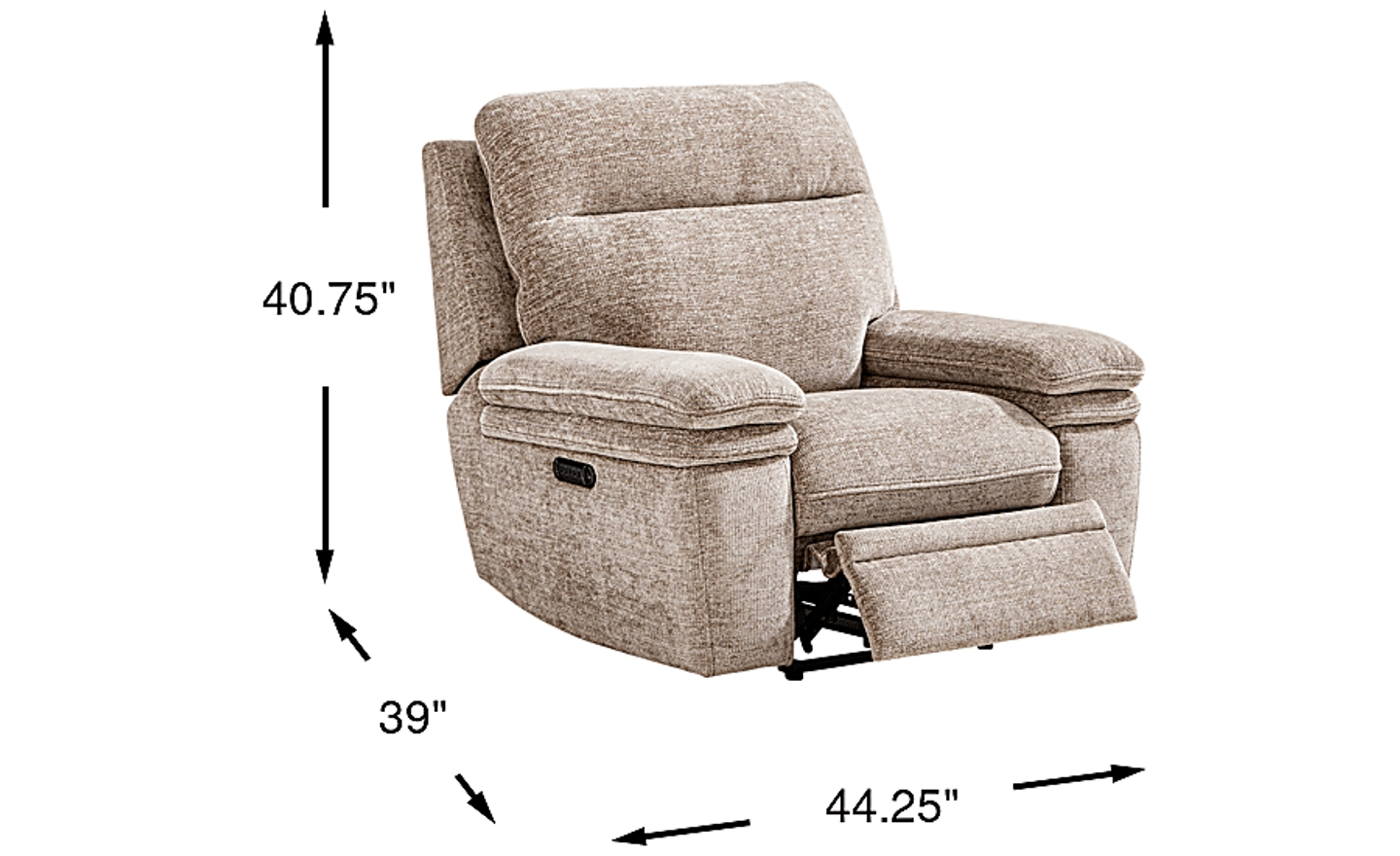 Like the deep calm and tranquil stillness of a private suite, the Anaheim collection embraces you with comfort that's effortlessly elegant. Upholstered in soft beige chenille, this contemporary recliner features subtly padded track arms and a deep tufted back cushion for a clean profile and indulgent relaxation. Dual power reclining allows personalized adjustment of both headrest and footrest, while USB ports are built into each reclining control panel for added convenience. Upholstery: 100% Polyester.