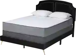 Find restful nights and enjoy the subtle luxury of the Anahma black queen bed. This stunning piece consists of a solid wood frame padded with foam and upholstered in sumptuous velvet fabric. The headboard features a beautiful nail head trim for a touch of classic splendor while scalloped detailing creates a crisp yet smooth silhouette. The Anahma needs both a box spring and mattress to function properly. Angled metal legs lend an added dose of grandeur, making the Anahma a magnificent bedroom centerpiece. Customer assembly is required.
