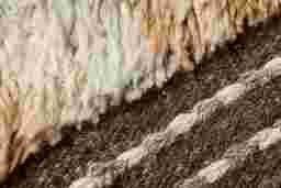 To preserve the shaggy Moroccan-style texture, we recommend regular, gentle maintenance. Use a soft-bristle brush or a low-suction hand vacuum attachment to remove dust from the wool fibers without pulling the knots. For the custom brown frame, a simple wipe with a dry, microfiber cloth is sufficient to maintain the finish. Avoid using liquid cleaners or harsh chemicals, which can damage natural wool fibers.