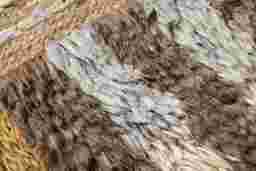Hand-knotted wool artwork provides a three-dimensional depth and tactile interest that traditional prints cannot match. This piece features a shaggy, Moroccan-style abstract design that adds physical warmth and subtle sound-dampening qualities to a room, making it an excellent choice for modern interiors with hard flooring or high ceilings.