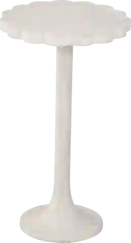 The Anawan white accent table features a sandblasted solid mango in a whitewash finish with a scallop top and tulip base design.