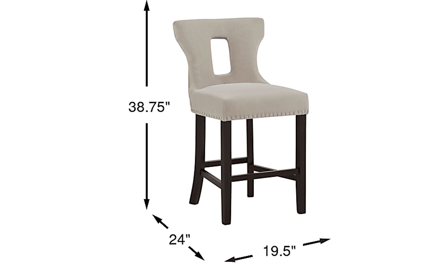 The Andalasia counter height stool demonstrates chic contemporary style for your dining room. Upholstered with velvety soft fabric, it showcases a versatile cream color. Nailhead accents along the base of the seat and a cut-out in the back create a sophisticated look. Crafted with pine solids, the curved legs feature a classic black finish that complements any room. Upholstery: 100% Polyester