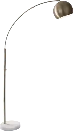 With a slim arched arm and a large dome-shaped metal shade the Andes Way floor lamp is a great way to achieve overhead lighting with style. A 150 Watt bulb can illuminate a large sitting area while an antique brass finish and chunky white marble base complement the decor of any room. Partial assembly may be required.