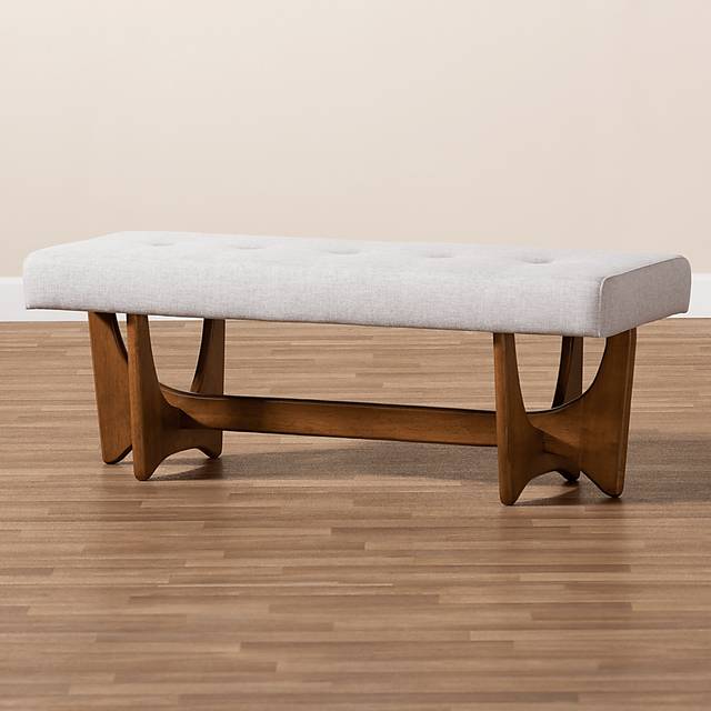 Add a touch of chic to your living room, entryway or bedroom with the Andor bench. Finished in brown wood with gray polyester fabric. Featuring a comfortable seat with plush foam padding and button tufting adds a tailored look. Customer service is required.