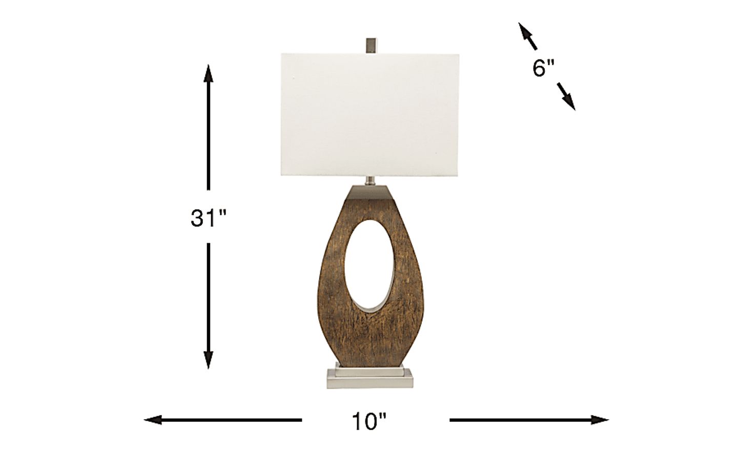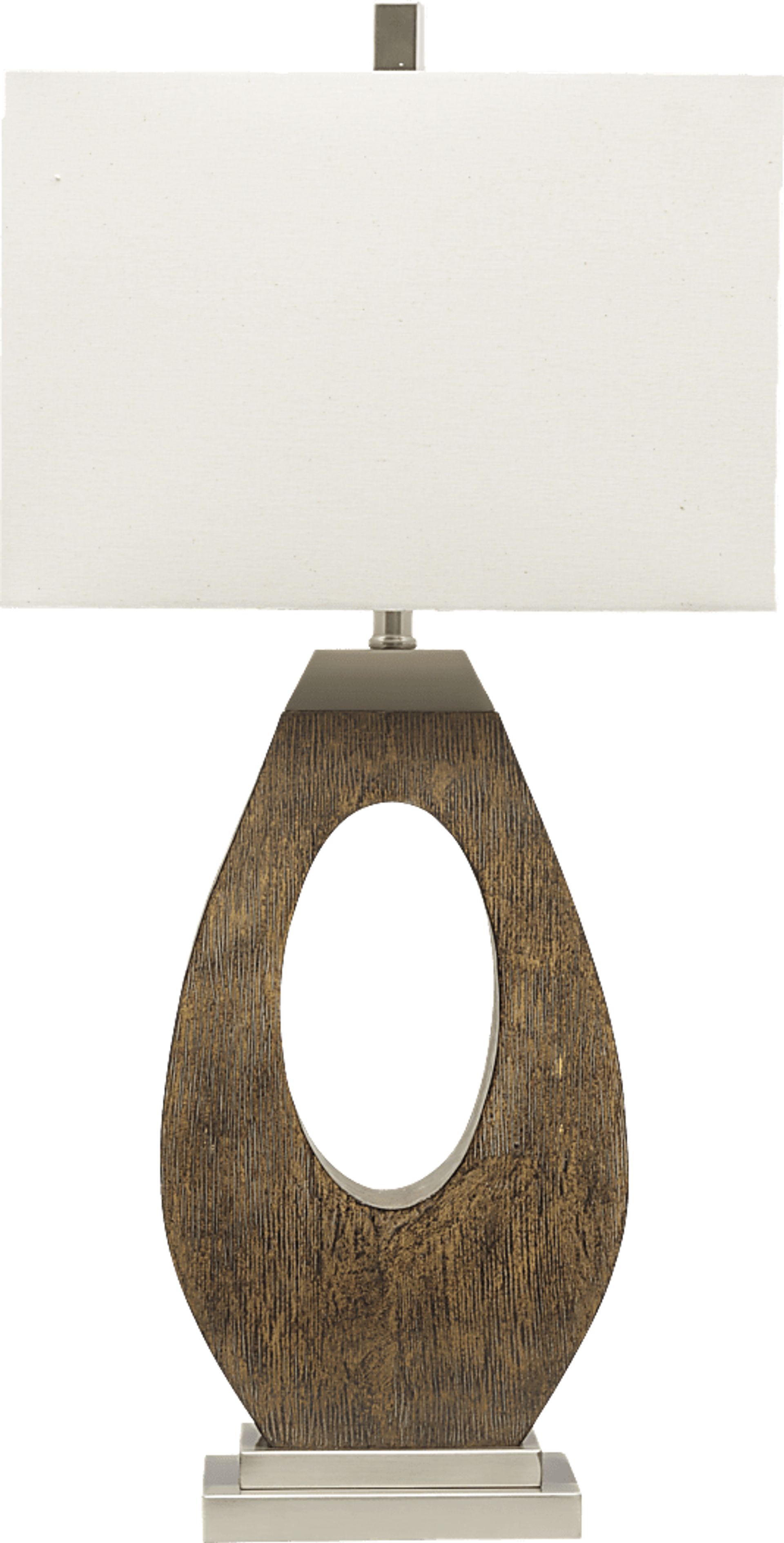 Curved lines and an open teardrop design combine to create the contemporary Andria lamp. The lamp's body, made of resin, is enhanced with a distressed brown painted stain and contrasting stainless steel base. An ivory colored drum style shade tops the piece in style. The lamp has a three-way switch and accommodates a 100 watt maximum bulb (not included).