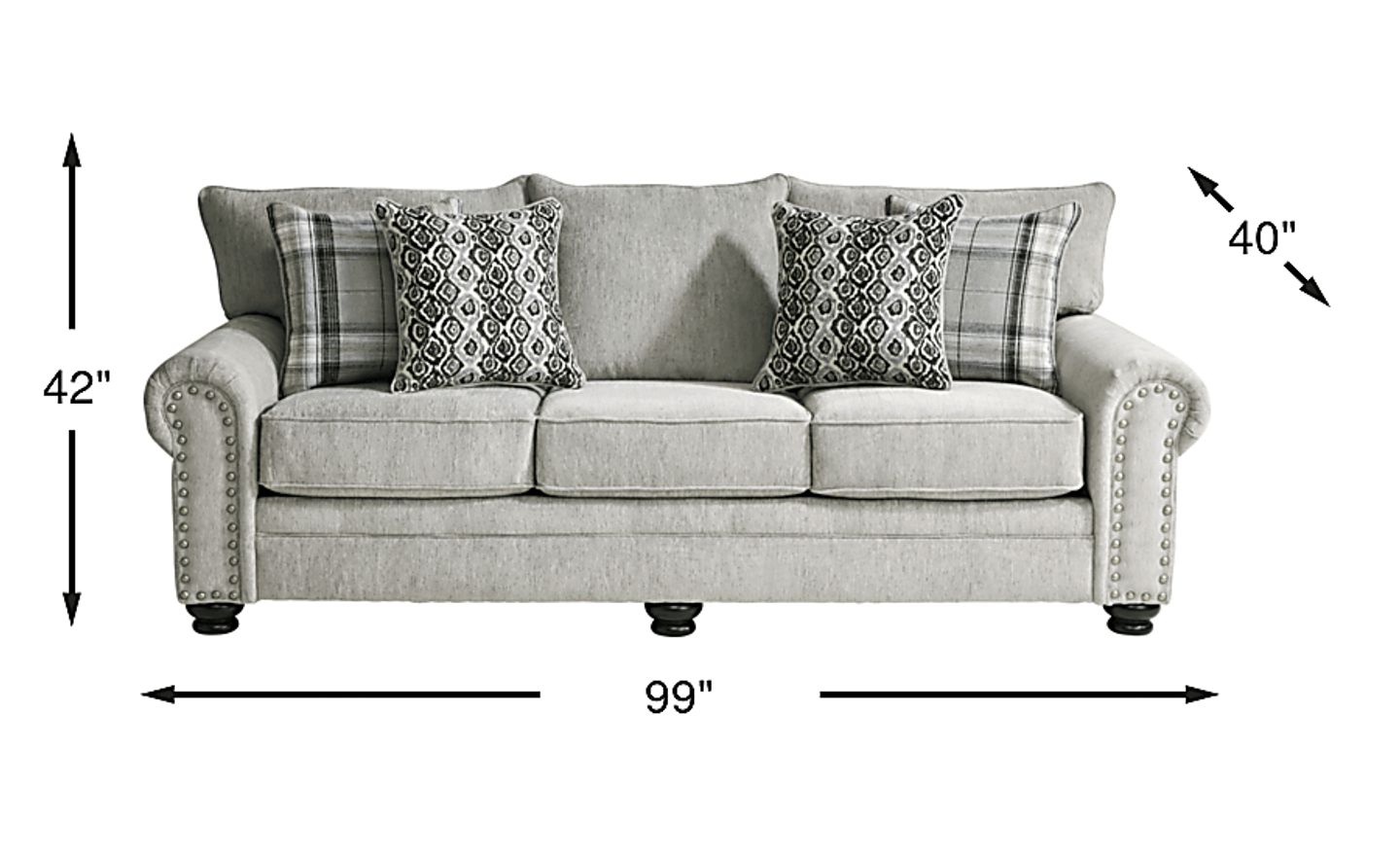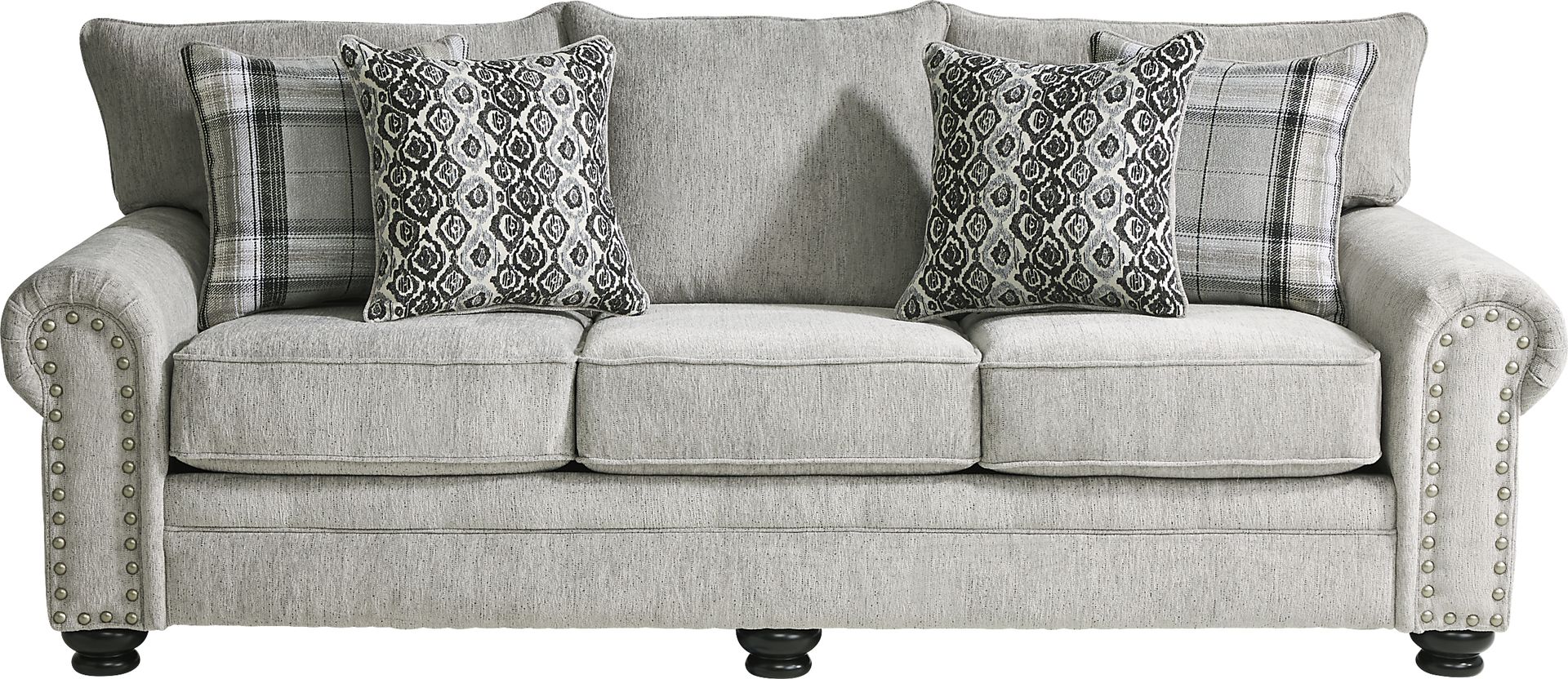 Boasting elegant traditional style, the Andrina Avenue sofa makes a stylish centerpiece for your living room. Upholstered in soft chenille fabric, it has a chic gray color. Lending a classic look are pleated roll arms featuring silver-finished nailhead accents. To help your piece last longer, seat cushions are reversible. Included accent pillows add a unique flair with plaid and ogee-inspired patterns. Bun feet in a black finish complete the aesthetic. 100% Polyester