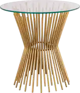 Enhance your home with this stylish Anellan end table. A clear glass top sits on an hourglass pedestal base, furnished from individual iron spokes finished in satin gold. This table will stand out alone or as a set. Customer assembly is required.