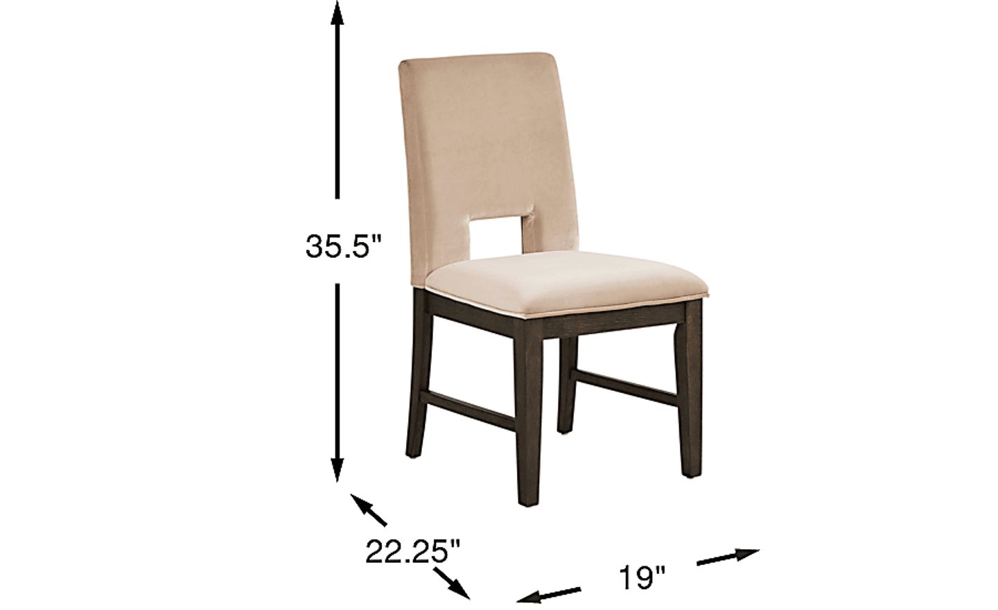 This chair features a standard seat height of 19 inches, specifically designed to pair comfortably with standard-height dining tables (which typically stand between 28 and 30 inches tall). With a width of 19 inches and a depth of 22.25 inches, we recommend allowing approximately 10 to 12 inches of clearance between the seat and your tabletop to ensure ample legroom and a comfortable dining experience for your guests.