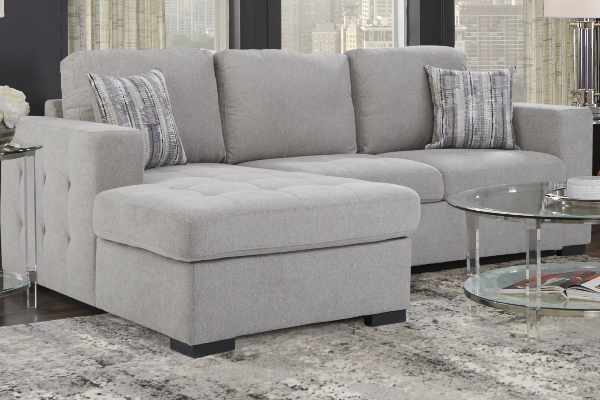 Raising the bar for functionality, the innovative design of the Angelino Heights sectional offers endless possibilities for seating and storage. This contemporary collection includes a fold-out queen size sleeper and a storage compartment in the chaise, making spontaneous overnight stays a breeze. Upholstered in gray textured woven fabric, this sectional boasts delicate tufting details on the seat cushions and exterior arms. Accent pillows, included, add a stylish touch. Upholstery: 100% Polyester.