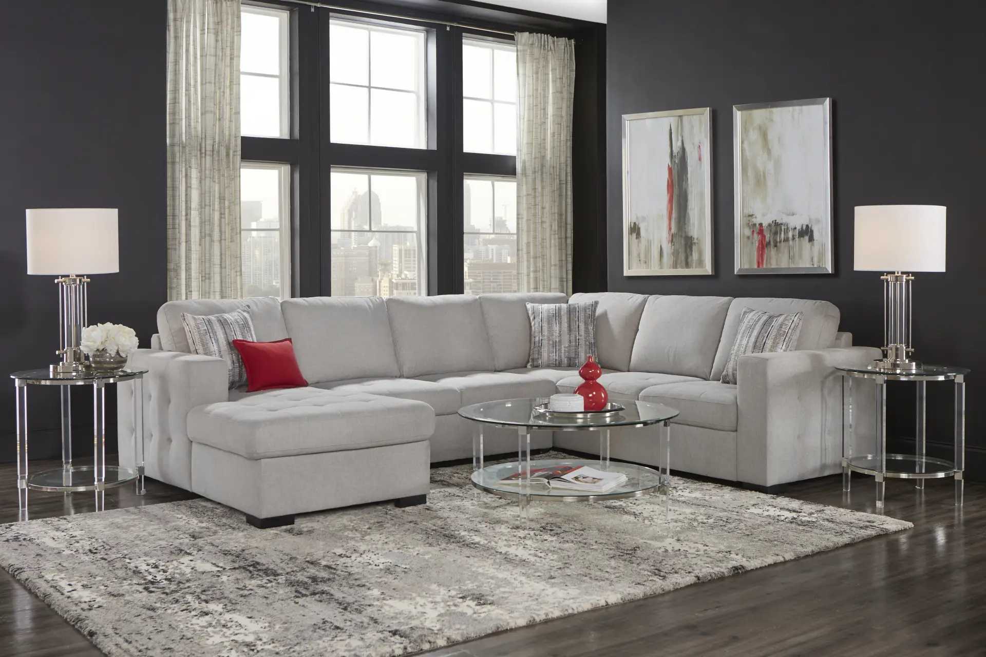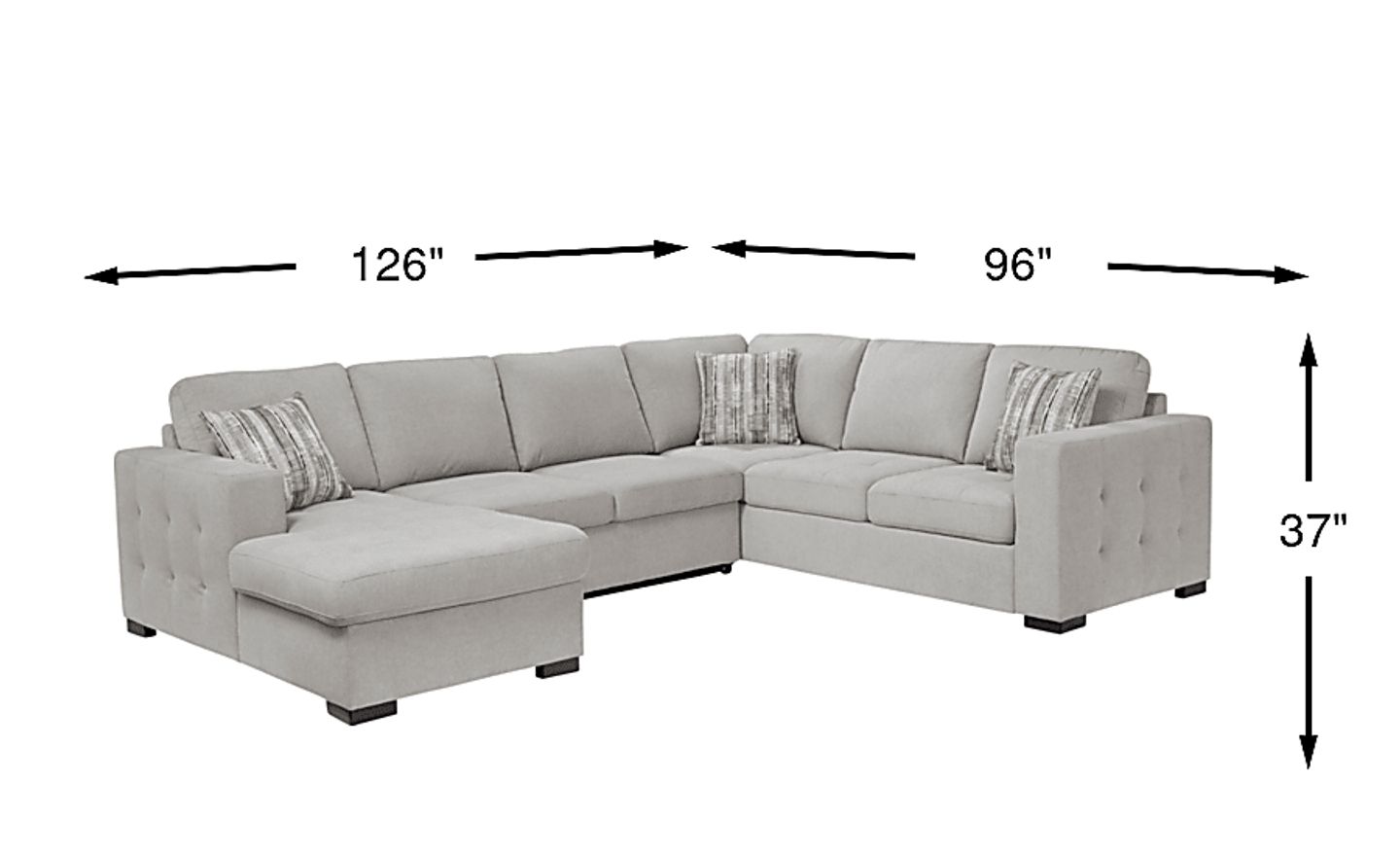 You no longer have to choose between functionality and style with the innovative design of the Angelino Heights sleeper sectional. Featuring sectional seating for up to six adults, this versatile sectional includes a fold out queen size sleeper and storage compartment in the end chaise. Upholstered in textured woven gray fabric, this contemporary sectional features delicate tufting detailing on the exterior arms and seat cushions. Included accent pillows add a stylish touch. 100% Polyester.
