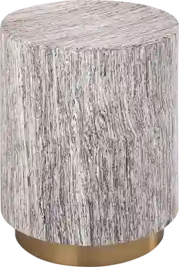 Inspired by petrified logs and singular designs, the Angelius table is a warm and homey accent piece. This table features a cylindrical body supported by a gold base, and neutral tones perfect for any setting. Customer assembly is required.
