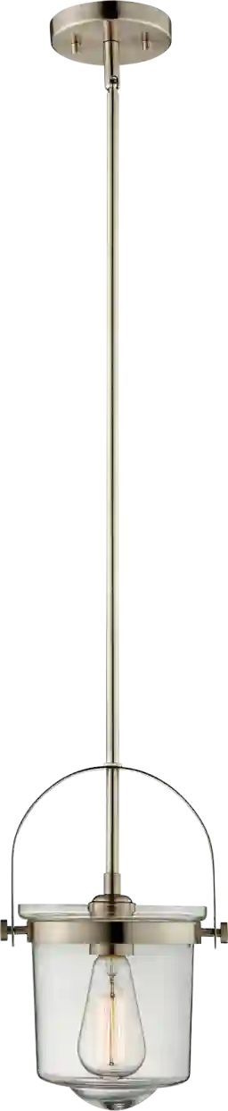Lend a bit of inviting, modern-industrial minimalism to your space with the Angels Peak Court brushed nickel and clear glass pendant light. Its simple steel framework features straight lines and curves in brushed nickel finish while its single light glows from within a clear glass urn shade. A 60 watt decorative vintage style Edison bulb is included. Professional installation by an electrician is recommended.