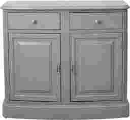 Distressing adds interest to a simple design for the Annette gray accent cabinet. The deep gray finish reveals lighter rub-through tones. Door knocker hardware opens the doors to reveal a contrasting pink interior that can also be found inside the top two drawers. Fluted pilasters with heavy frame and overlay details add to the traditional feel of the piece, while the weathered finish adds an approachable, old world element. Some customer assembly required.