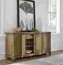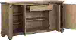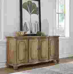 Familiar yet fresh, the Antelligence brown buffet combines a casual attitude with traditional French flair. This stylish buffet features a shaped case with walnut inlay on the top and bun feet for stability. One drawer and five adjustable shelves behind four doors offers a well-designed storage space for your tableware, napkins and more. Place it anywhere, from dining room to lobby areas to create a definite focal point. Customer assembly is required.