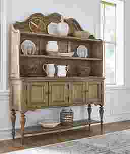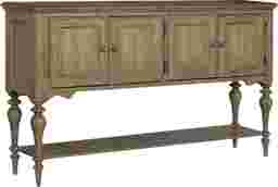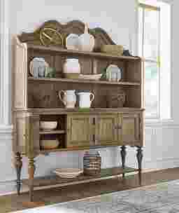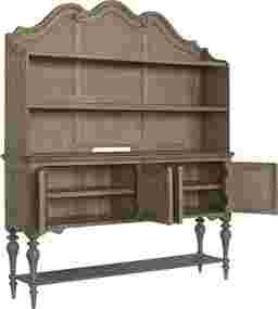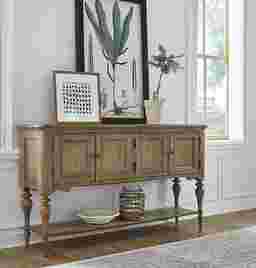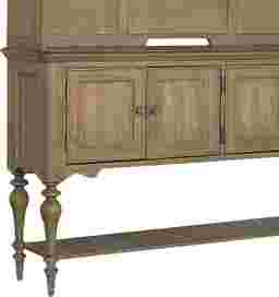 Familiar yet fresh, the Antelligence brown sideboard combines a casual attitude with traditional French flair. Stylish sideboard features two open shelves with plate grooves, a woven sisal back for textural interest and a shaped top with scroll work. The sideboard hutch has four doors with one adjustable shelf for concealed storage, walnut inlay on top and a shelf at the bottom to display home decor. Customer assembly is required.