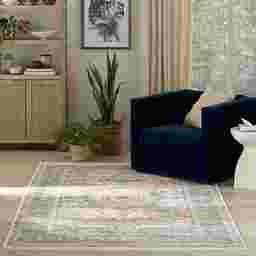 The silky sheen is a sophisticated design feature that allows the rug to interact dynamically with natural light. Depending on the time of day and the angle of the sun, the colors may appear to shift and capture highlights, adding a sense of movement and depth to the vintage pattern. This reflective quality is particularly effective in brightening rooms with large windows or coastal homes where natural light is abundant.