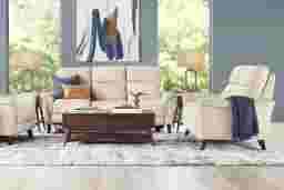Serene relaxation with quiet elegance is reimagined in the Antonella collection from Cindy Crawford Home, where sculptural form, refined details, and luxurious comfort come together. Exquisitely modern, this living room is upholstered in beige top grain leather where the body touches and features a clean, sleek frame. Deep channeled back cushions and subtly angled headrests on the sofa and recliner offer supportive comfort, while slim, padded roll arms and tapered wood legs in a brown finish give each piece a sculptural, elevated look. Dual power reclining with zero gravity adjustable headrest and footrest allow you to customize your comfort. Integrated USB ports on each control panel keep your devices charged and close at hand. The matching stationary loveseat offers extra seating for conversation, connection, and everyday moments. Upholstery: Top grain leather where the body touches and vinyl sides and backs. Leather is a durable, low maintenance product; however, general regular maintenance is necessary. To keep your leather clean, vacuum it regularly, removing any dust, and clean it with water and a mild non-detergent soap. Lamps not as shown in room image. Accent pillows not included.