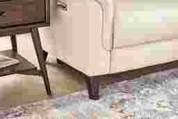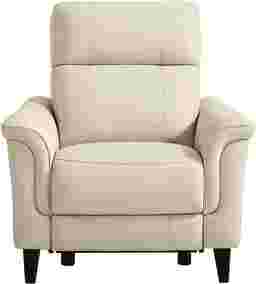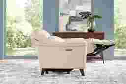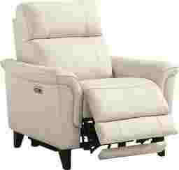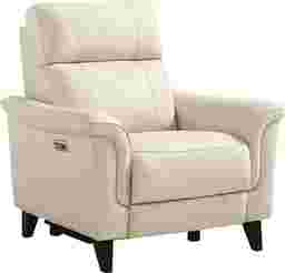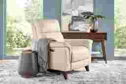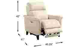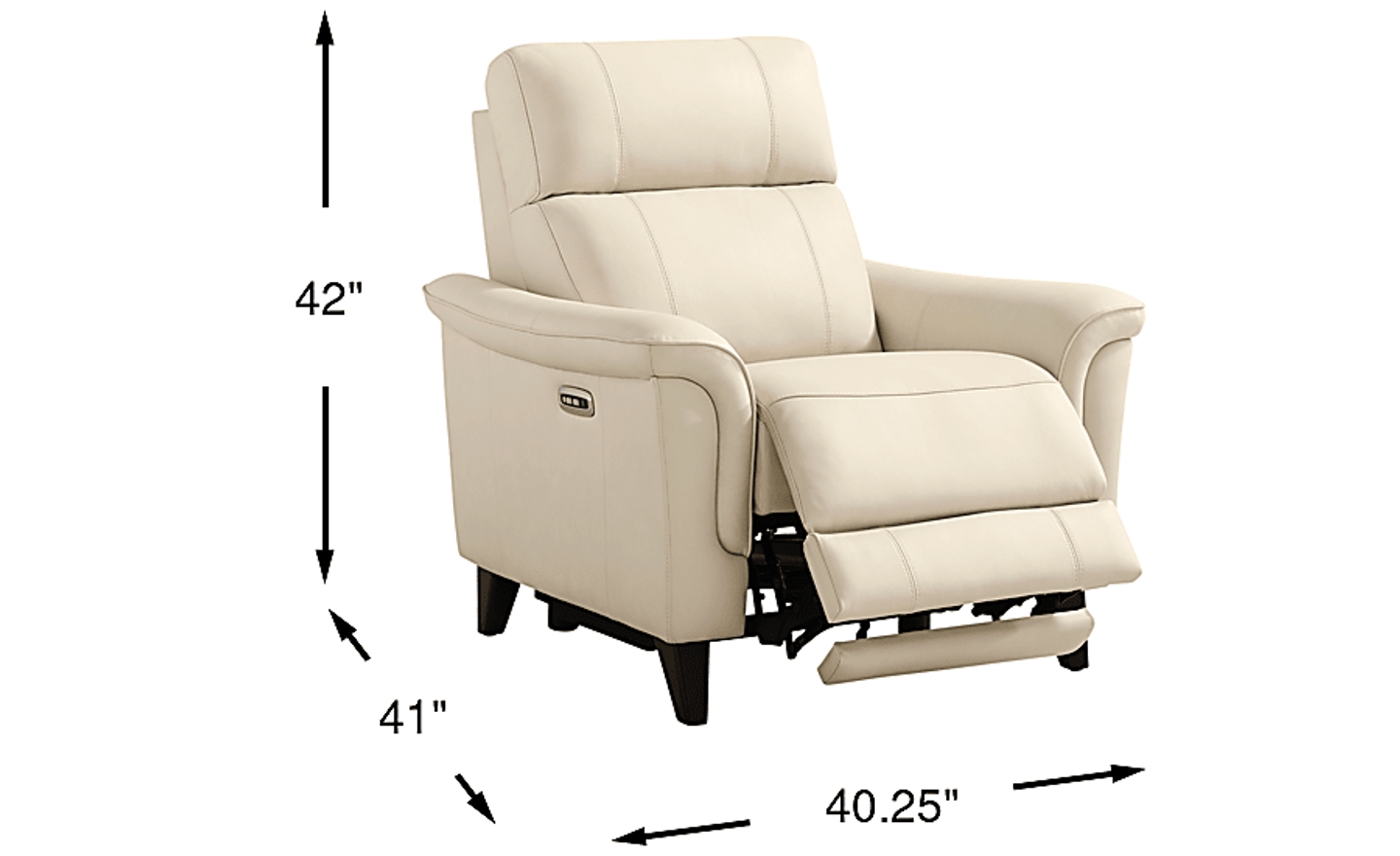 Serene relaxation with quiet elegance is reimagined in the Antonella collection from Cindy Crawford Home, where sculptural form, refined details, and luxurious comfort come together. Exquisitely modern, this recliner is upholstered in beige top grain leather where the body touches and features a clean, sleek frame. Deep channeled back cushions and subtly angled headrests offer supportive comfort, while slim, padded roll arms and tapered wood legs in a brown finish give the silhouette a sculptural, elevated look. Dual power reclining with zero gravity adjustable headrest and footrest allow you to customize your comfort. Integrated USB ports on each control panel keep your devices charged and close at hand. Upholstery: Top grain leather where the body touches with vinyl sides and backs.