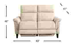 Serene relaxation with quiet elegance is reimagined in the Antonella collection from Cindy Crawford Home, where sculptural form, refined details, and luxurious comfort come together. Exquisitely modern, this loveseat is upholstered in beige top grain leather where the body touches and features a clean, sleek frame. Deep channeled back cushions and subtly angled headrests offer supportive comfort, while slim, padded roll arms and tapered wood legs in a brown finish give the silhouette a sculptural, elevated look. Dual power reclining with zero gravity adjustable headrest and footrest allow you to customize your comfort. Integrated USB ports on each control panel keep your devices charged and close at hand. Upholstery: Top grain leather where the body touches with vinyl sides and backs.