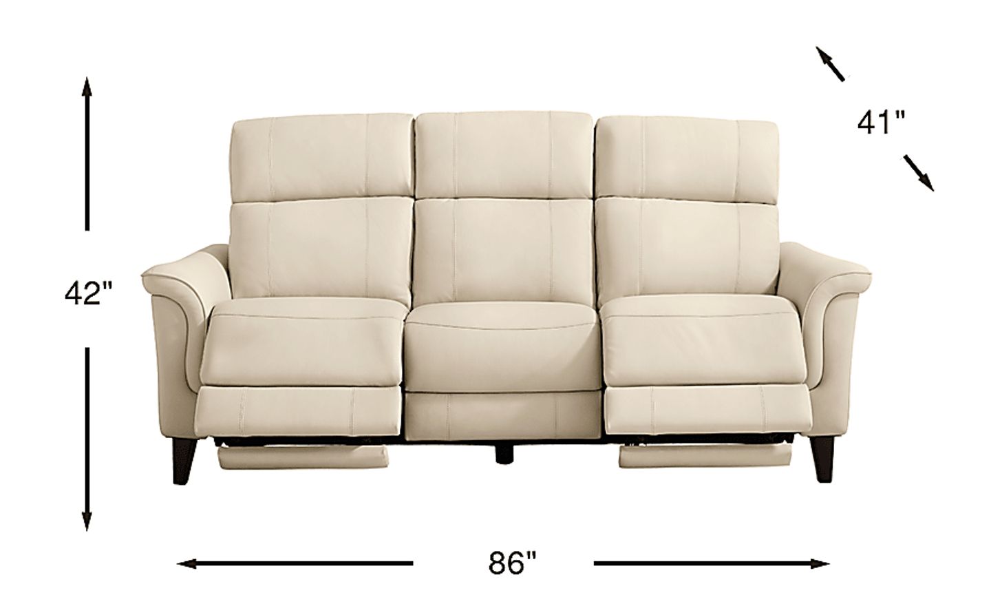 Serene relaxation with quiet elegance is reimagined in the Antonella collection from Cindy Crawford Home, where sculptural form, refined details, and luxurious comfort come together. Exquisitely modern, this sofa is upholstered in beige top grain leather where the body touches and features a clean, sleek frame. Deep channeled back cushions and subtly angled headrests offer supportive comfort, while slim, padded roll arms and tapered wood legs in a brown finish give the silhouette a sculptural, elevated look. Dual power reclining with zero gravity adjustable headrest and footrest allow you to customize your comfort. Integrated USB ports on each control panel keep your devices charged and close at hand. Upholstery: Top grain leather where the body touches with vinyl sides and backs.