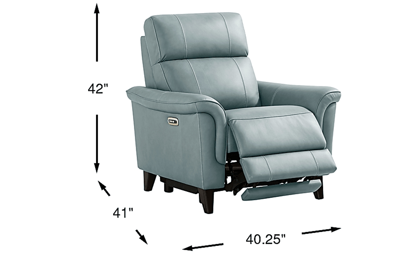 Serene relaxation with quiet elegance is reimagined in the Antonella collection from Cindy Crawford Home, where sculptural form, refined details, and luxurious comfort come together. Exquisitely modern, this recliner is upholstered in blue top grain leather where the body touches and features a clean, sleek frame. Deep channeled back cushions and subtly angled headrests offer supportive comfort, while slim, padded roll arms and tapered wood legs in a brown finish give the silhouette a sculptural, elevated look. Dual power reclining with zero gravity adjustable headrest and footrest allow you to customize your comfort. Integrated USB ports on each control panel keep your devices charged and close at hand. Upholstery: Top grain leather where the body touches with vinyl sides and backs.