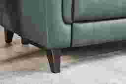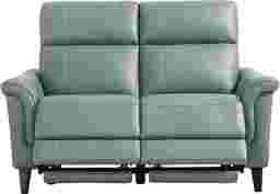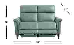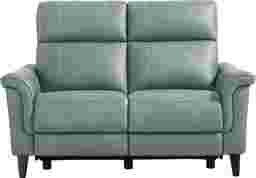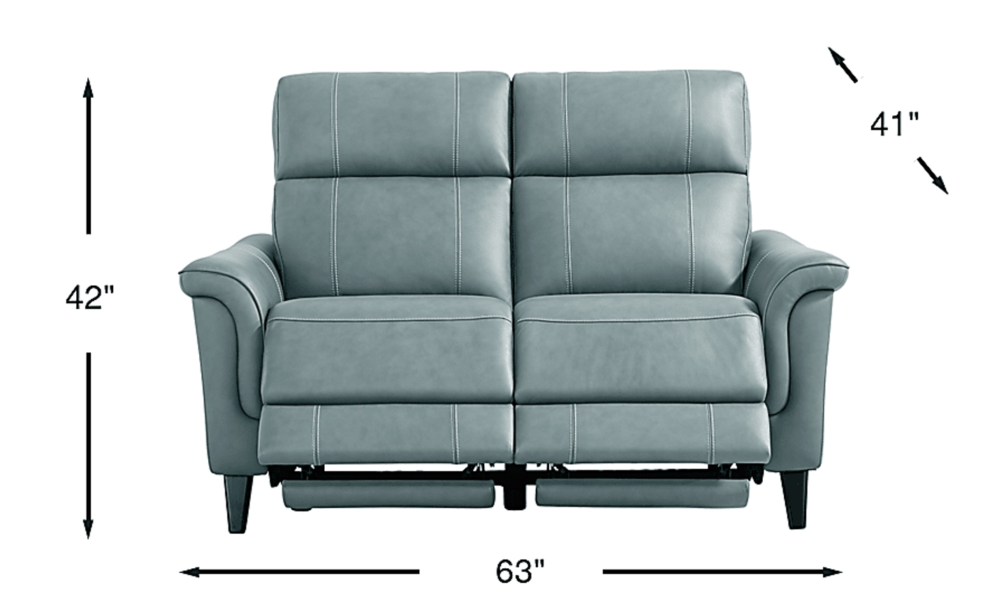 Serene relaxation with quiet elegance is reimagined in the Antonella collection from Cindy Crawford Home, where sculptural form, refined details, and luxurious comfort come together. Exquisitely modern, this loveseat is upholstered in blue top grain leather where the body touches and features a clean, sleek frame. Deep channeled back cushions and subtly angled headrests offer supportive comfort, while slim, padded roll arms and tapered wood legs in a brown finish give the silhouette a sculptural, elevated look. Dual power reclining with zero gravity adjustable headrest and footrest allow you to customize your comfort. Integrated USB ports on each control panel keep your devices charged and close at hand. Upholstery: Top grain leather where the body touches with vinyl sides and backs.
