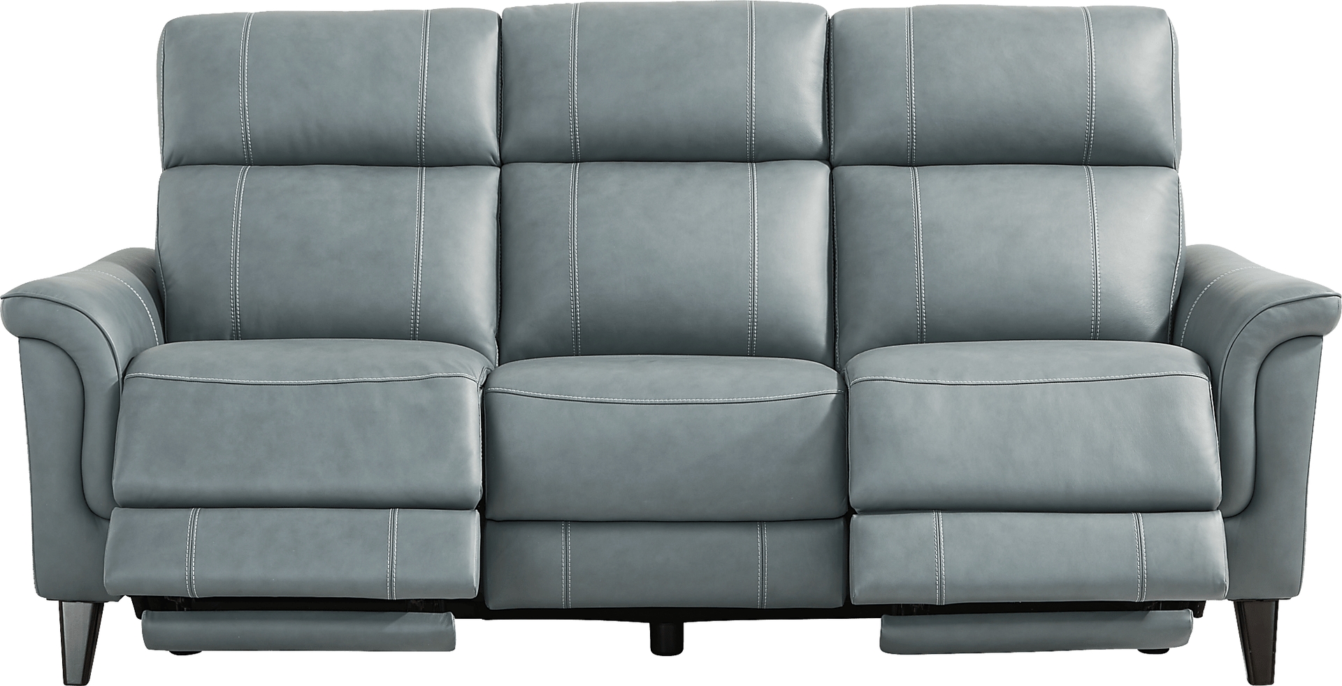 Serene relaxation with quiet elegance is reimagined in the Antonella collection from Cindy Crawford Home, where sculptural form, refined details, and luxurious comfort come together. Exquisitely modern, this sofa is upholstered in blue top grain leather where the body touches and features a clean, sleek frame. Deep channeled back cushions and subtly angled headrests offer supportive comfort, while slim, padded roll arms and tapered wood legs in a brown finish give the silhouette a sculptural, elevated look. Dual power reclining with zero gravity adjustable headrest and footrest allow you to customize your comfort. Integrated USB ports on each control panel keep your devices charged and close at hand. Upholstery: Top grain leather where the body touches with vinyl sides and backs.