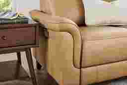 Serene relaxation with quiet elegance is reimagined in the Antonella collection from Cindy Crawford Home, where sculptural form, refined details, and luxurious comfort come together. Exquisitely modern, this loveseat is upholstered in tan top grain leather where the body touches and features a clean, sleek frame. Deep channeled back cushions and subtly angled headrests offer supportive comfort, while slim, padded roll arms and tapered wood legs in a brown finish give the silhouette a sculptural, elevated look. Dual power reclining with zero gravity adjustable headrest and footrest allow you to customize your comfort. Integrated USB ports on each control panel keep your devices charged and close at hand. Upholstery: Top grain leather where the body touches with vinyl sides and backs.