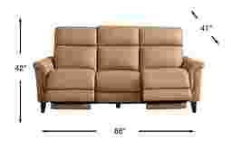 Serene relaxation with quiet elegance is reimagined in the Antonella collection from Cindy Crawford Home, where sculptural form, refined details, and luxurious comfort come together. Exquisitely modern, this sofa is upholstered in tan top grain leather where the body touches and features a clean, sleek frame. Deep channeled back cushions and subtly angled headrests offer supportive comfort, while slim, padded roll arms and tapered wood legs in a brown finish give the silhouette a sculptural, elevated look. Dual power reclining with zero gravity adjustable headrest and footrest allow you to customize your comfort. Integrated USB ports on each control panel keep your devices charged and close at hand. Upholstery: Top grain leather where the body touches with vinyl sides and backs.