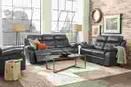 Timeless, sophisticated design and elegant tufted detailing in the Antonin reclining loveseat create a relaxing intimacy in any room. Contemporary in style and upholstered in blue top grain leather where the body touches, this piece features pillow pad arms, padded outside arms and back, and attached seat cushions for a luxurious feel. The reclining feature adjusts to your personal preference, making it perfect for family gatherings and peaceful nights in.