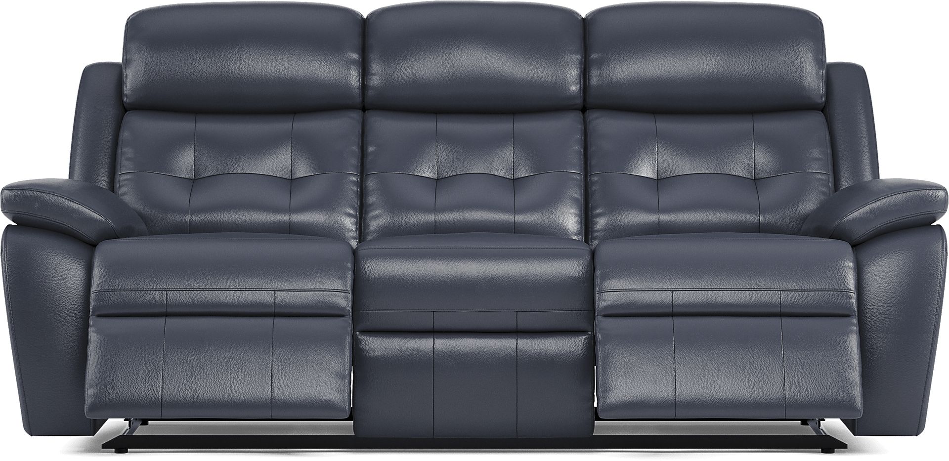 The Antonin Blue Reclining Sofa is upholstered in top grain leather where the body touches, with durable polyurethane on the sides and back. Top grain leather is known for its resilience and softness, offering a balance of luxury and practicality for everyday living. The combination ensures a consistent look and feel while providing robust performance in high-use areas.