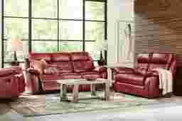 Timeless, sophisticated design and elegant tufted detailing in the Antonin reclining living room create a relaxing intimacy in any room. Contemporary in style and upholstered in red top grain leather where the body touches, this set features pillow pad arms, padded outside arms and back, and attached seat cushions for a luxurious feel. The reclining feature of both the sofa and loveseat adjusts to your personal preference, making it perfect for family gatherings and peaceful nights in. Upholstery: Top grain leather where the body touches and polyurethane fabric sides and backs. Leather is a durable, low maintenance product, however, general regular maintenance is necessary. To keep your leather clean, vacuum it regularly, removing any dust, and clean it with water and a mild non-detergent soap. Accent pillows not included.