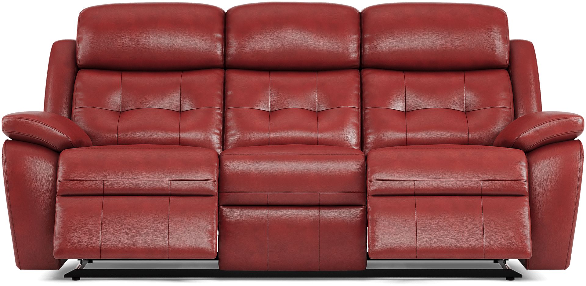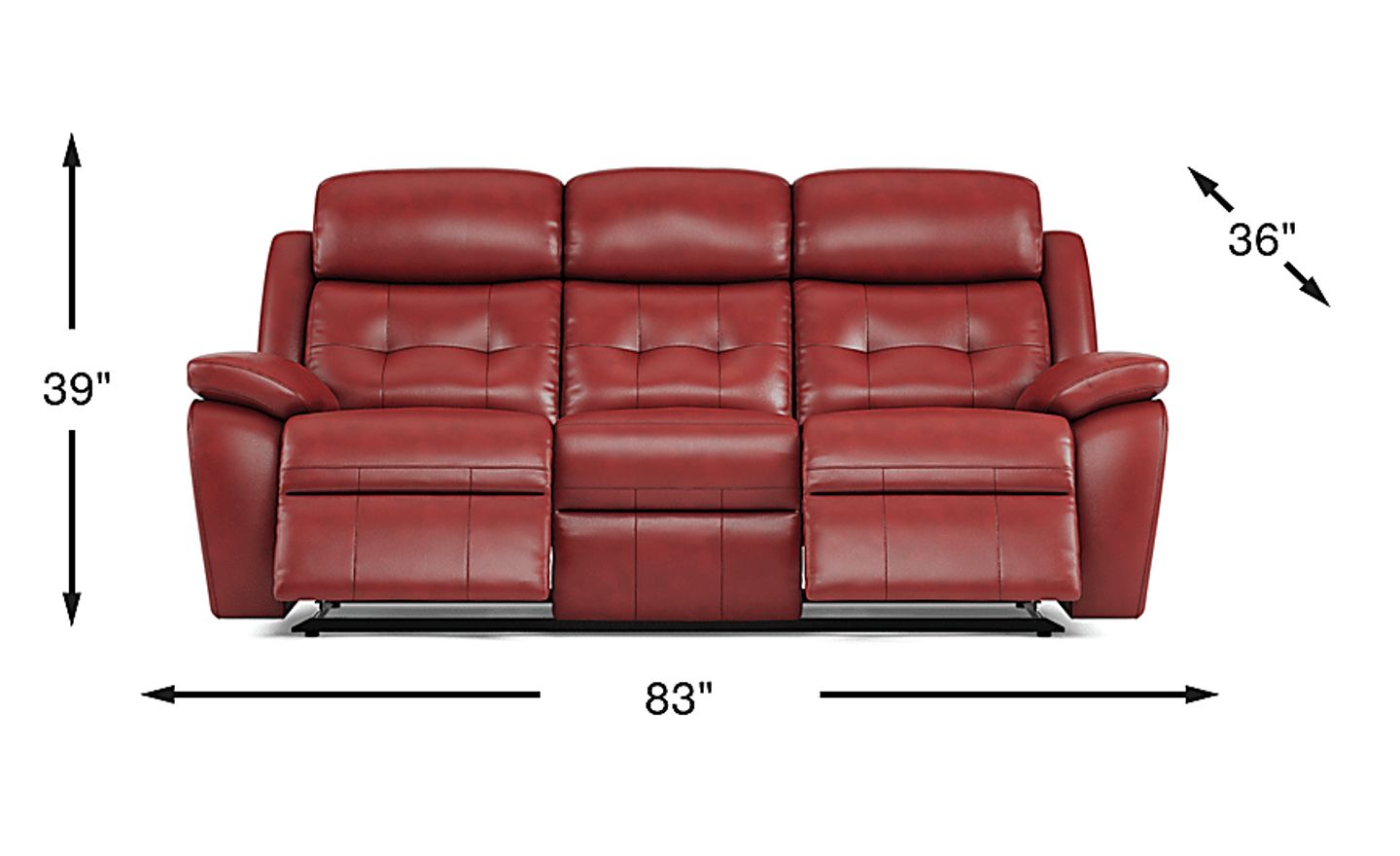 The Antonin Red Leather Power Reclining Sofa measures 83 inches wide, 36 inches deep, and 39 inches high. While it comfortably accommodates three people, we strongly recommend measuring your specific living space, including all entryways like doorways and hallways, to ensure both the sofa's fit during delivery and adequate room for its reclining function.