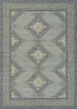 This blue toned rug from the Apexi collection showcases a tribal like pattern, with zig zagging detailed features and an ornate border surrounding the entirety of it. Machine printed on a blend of wool and nylon fibers this rug calls subtle attention to itself in your space thanks to its soft pastel colorway. Spot clean with a dry, clean cloth and vacuum without a beater bar to maintain the appearance and longevity of your rug.