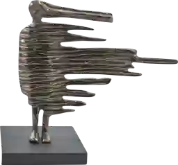 The Apiyo is a powerful expression of movement and form. Infuse your home or office with a sense of motion and artistry with this sculpture, a captivating piece that beautifully portrays the human form in motion. The design uniquely captures the essence of a person being blown by an invisible force; the body appears to be gently twisted, with ribbed metal details that emphasize the sense of movement, energy, and fluidity. The sculpture features intact legs and feet on one side, grounding the piece while allowing the other half of the body to flow and bend with the breeze, creating a dynamic contrast. The dark silver finish of the metal adds depth and sophistication, making this piece a timeless addition to any decor. Standing firmly on a sleek black base, the sculpture commands attention with its fluid, almost ethereal design. Whether placed in a living room, entryway, or office, it adds an artistic and modern touch, perfect for those who appreciate movement, creativity, and individ