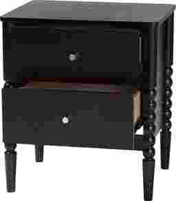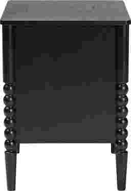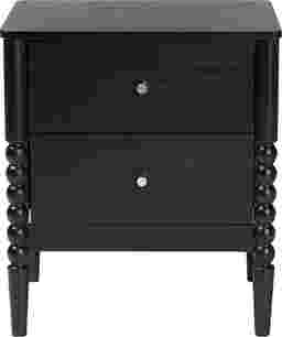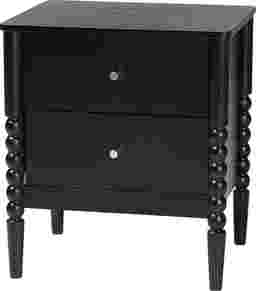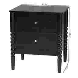 The vintage artistry of the exuberant Appiation black nightstand brings traditional flair to your bedroom. This mid-century inspired piece is crafted from sturdy wood. Turned bobbin embellishments envelop the legs for a captivating display rich with classic charm. The Appiation features two drawers to accommodate your bedside essentials while reserving the tabletop for nightly use. Minimalist metal drawer knobs add a touch of glamour, making the Appiation a marvelous bedroom element. Customer assembly is required.