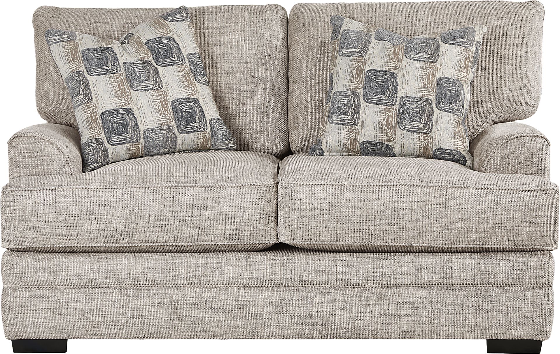 Yes, this loveseat includes eclectically patterned throw pillows in a neutral palette specifically curated to complement the "Dove" gray upholstery. These designer-selected accents provide both a visual "pop" to your living room and added lumbar support, allowing you to achieve a finished, professional look immediately upon delivery.