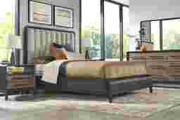 Uniquely extravagant yet quietly reserved, the Archer Grove bedroom is a seamless blend of luxury and downhome comfort with a Zen-like calming aesthetic. Modern in style, this collection is constructed of wood solids and elm veneers with lacquer finish. The bed's upholstered headboard features provocative vertical channeling framed by the contrasting rich black color of the rest of the bed's frame. The 9-drawer dresser also showcases a contrast of colors to stunning effect. Equipped with metal pulls and English dovetail joints in the front and back with side mounted ball bearing glides accompanied by levelers, its easy, sturdy functionality is a joy day in and day out. The minimalist mirror, framed in the same rich black as the rest of the set, showing off its vertical presence with stately charm is the ultimate final touch. Mattress and foundation (if required) sold separately. Bed shown is queen size.