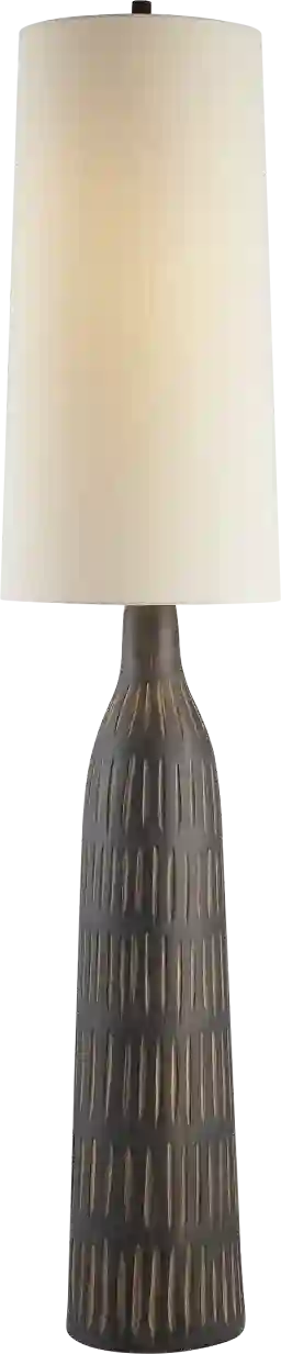 A substantial floor lamp in a rich brown wood finish, the Ardmore Land floor lamp is expertly crafted from resin with an intricate hand-carved pattern. Topped with a tall, modified oatmeal linen drum shade enhances its elegance, adding texture and a warm, inviting glow to any decor.