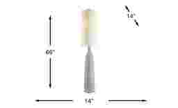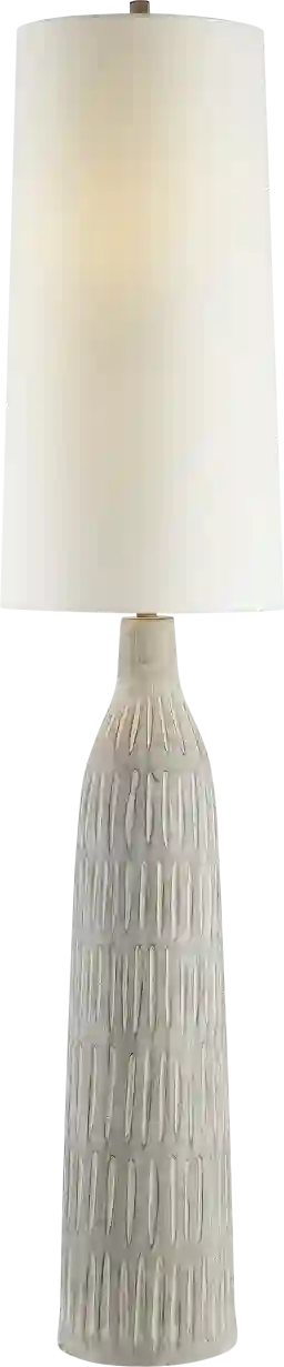 A substantial floor lamp in a graceful gray wash driftwood finish, Ardmore Land floor lamp is expertly crafted from resin with an intricate hand-carved pattern. Topped with a tall, modified white linen drum shade enhances its elegance, adding texture and a warm, inviting glow to any decor.