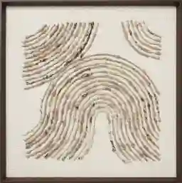 Argali is hand-woven wall art with a brown-and-ivory curving abstract design, a neutral accent for bohemian or natural home decor. The artwork is crafted from wool, cotton, polyester, and other fibers, measuring 33" x 33". Each piece is custom-framed, so dimensions may vary slightly (up to 1").