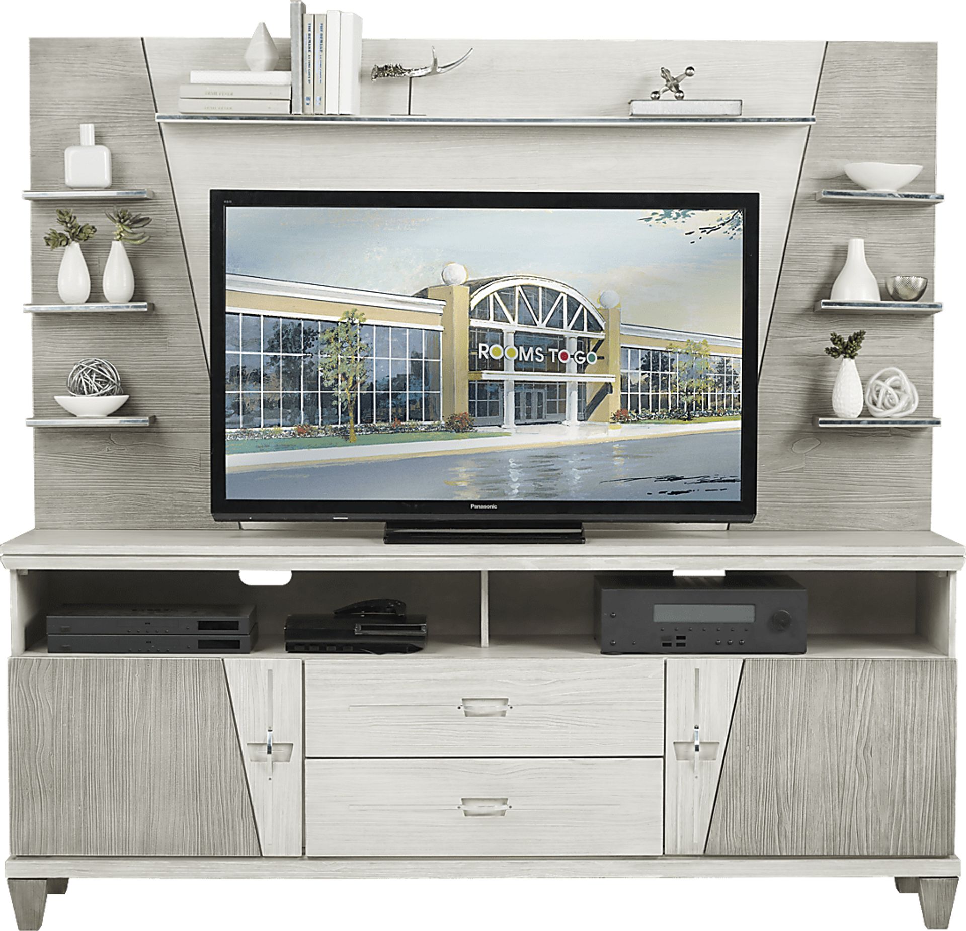 Keep your electronics in contemporary style with the Argento wall unit. This home entertainment center features a back panel with floating shelves and a cut-out for cords while the 80 inch console offers plenty of room for a large flat screen TV and more. The open cubbies, with pass through holes for wire management, are perfect for gaming systems and other electronics while the spacious drawers below offer concealed storage including a built-in tray for remote controls. One adjustable shelf is located behind each door. Sporting a two-tone washed and brushed gray finish, this wall unit is crafted with pine solids and pine veneers. Chrome accents and hardware complete the contemporary aesthetic.