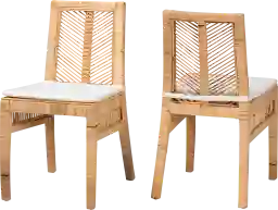 Invoke the appeal of a tropical paradise in your space with the remarkable Argolana II brown side chair set of 2. This chair is comprised of a sturdy mahogany wood frame wrapped in natural rattan. Each seat features a plush, fabric upholstered cushion for superb comfort while slim rattan rods form an eye-catching yet smooth backrest. The Argolana II will arrive fully assembled and utilizes angled legs for excellent stability and support. Boasting a simple yet expressive design inspired by exotic aesthetics, the Argolana II stands out as an exquisite addition to any dining space. Due to the nature of the natural materials used in this product, it may have variations in areas such as, but not limited to, color, pattern, grain and texture. The hair-like strands of rattan/rattan-fiber are common due to nature of the material.