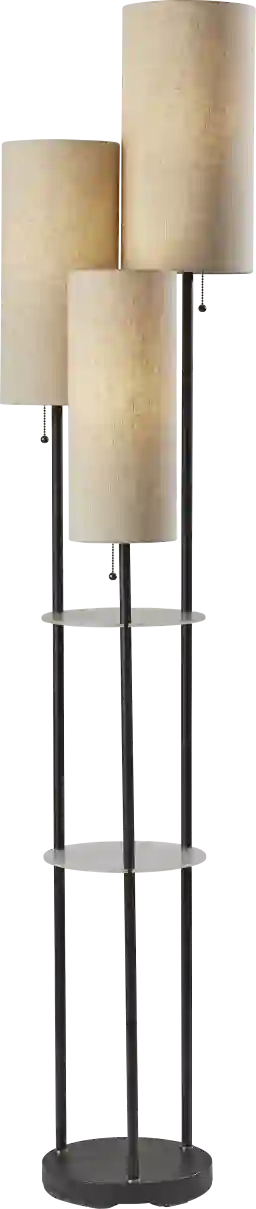 The Ariella Cove floor lamp offers plenty of light and offers easy storage solutions within a decorative yet small footprint which is perfect for any space in your home. Three black poles secured in a round base each hold a brown textured cylindrical shade. The poles also support two frosted acrylic shelves for display or to store accents for your home. Set this lamp next to the sofa for the perfect mix of side table and light. Partial assembly may be required.