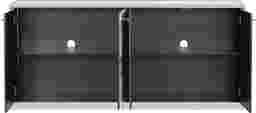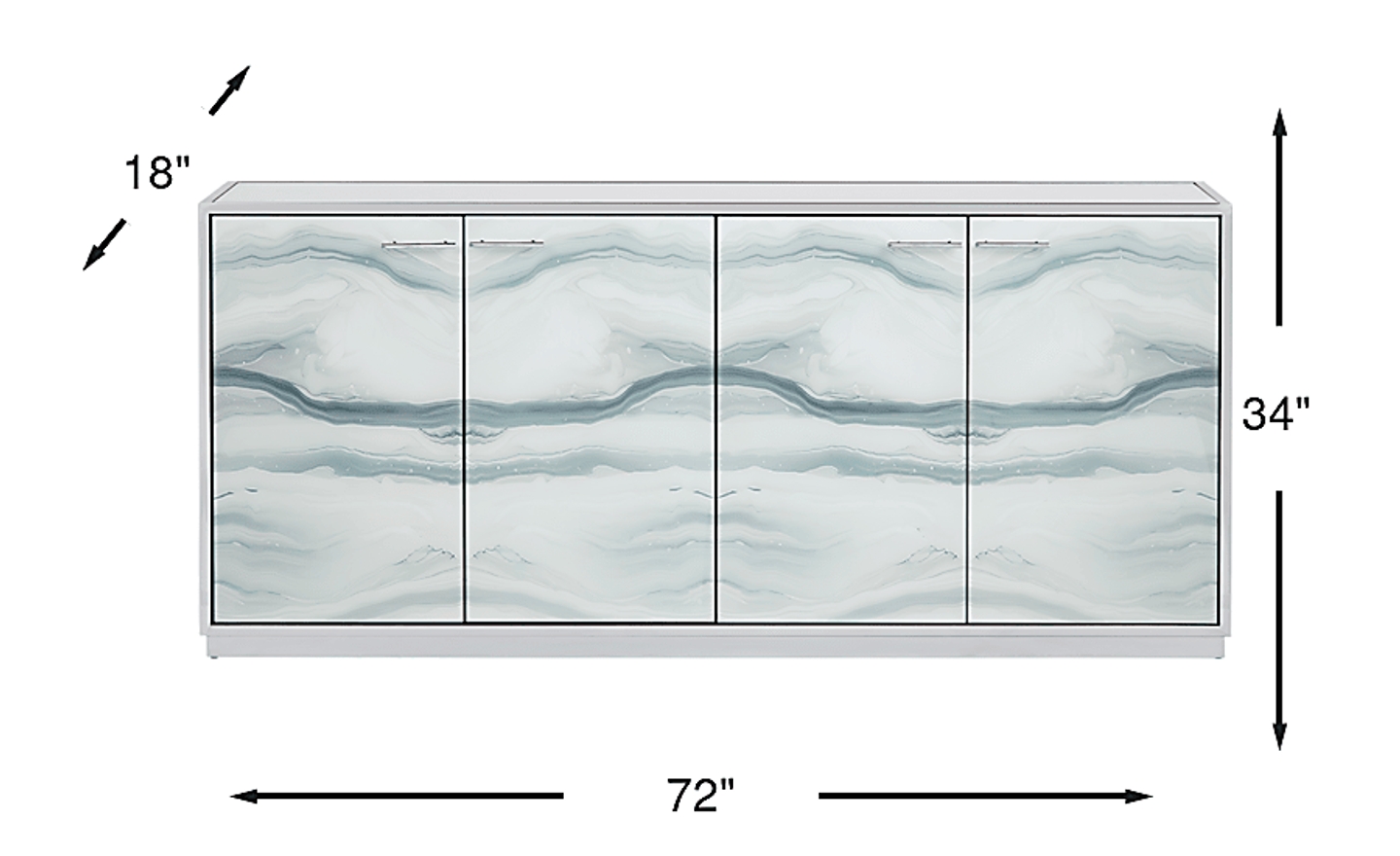 Shimmering sophistication ripples like the way of water with the Arielle credenza anchoring your living space. Flowing patterns ebb across mirrored glass doors in shades of silver and gray, creating a mesmerizing surface that captures light from every angle. Framed in sleek silver trim with minimalist hardware, this console features four gleaming doors that open to reveal two fixed shelves, offering chic, concealed storage for your living space.