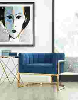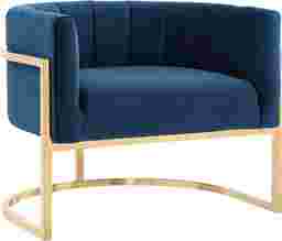 Trend-setting colors and metal detailing make the Arietta navy accent hair the new must-have. Fabulously chic from any angle, with navy velvet upholstery and stainless steel gold frame, it will no doubt dazzle in any room.